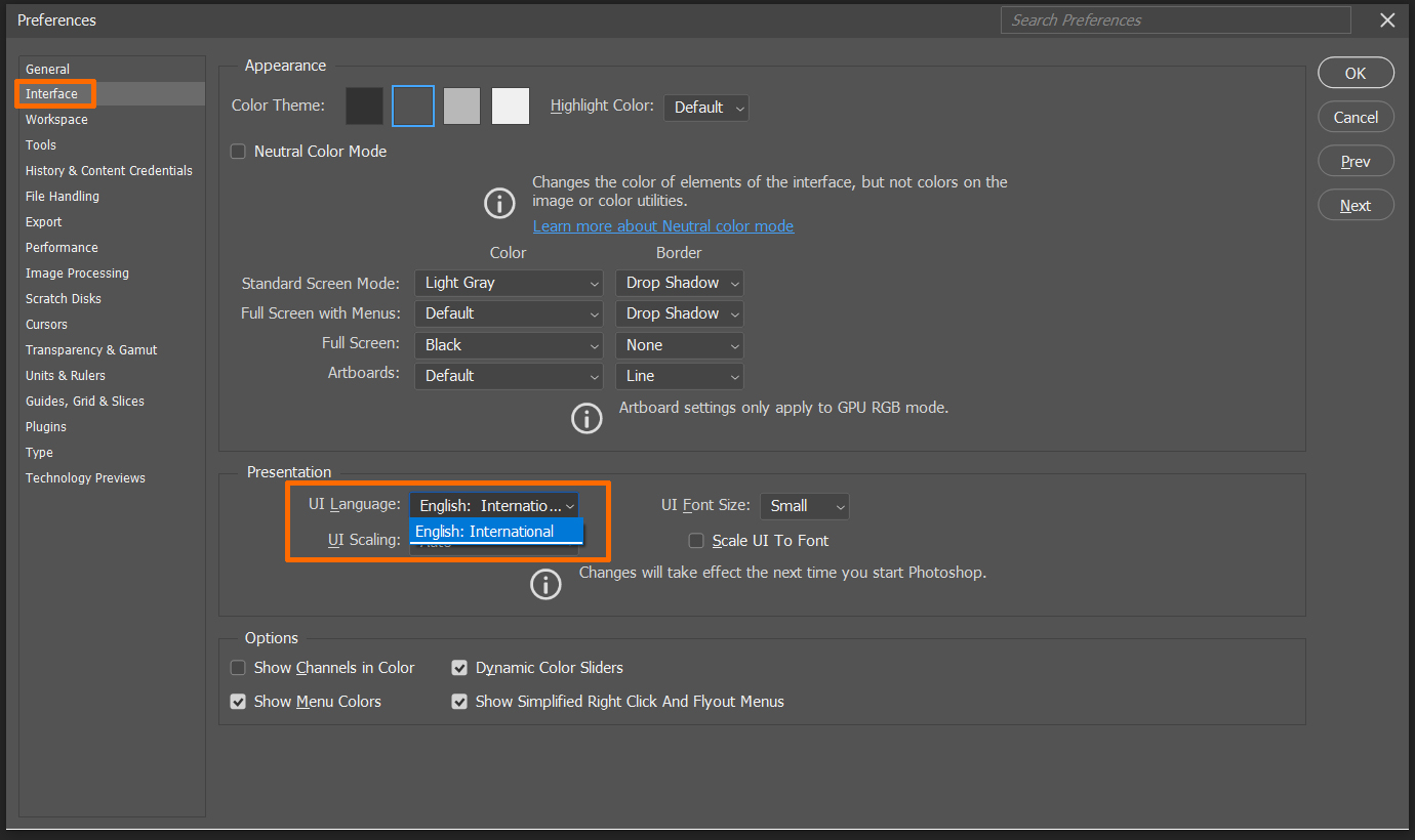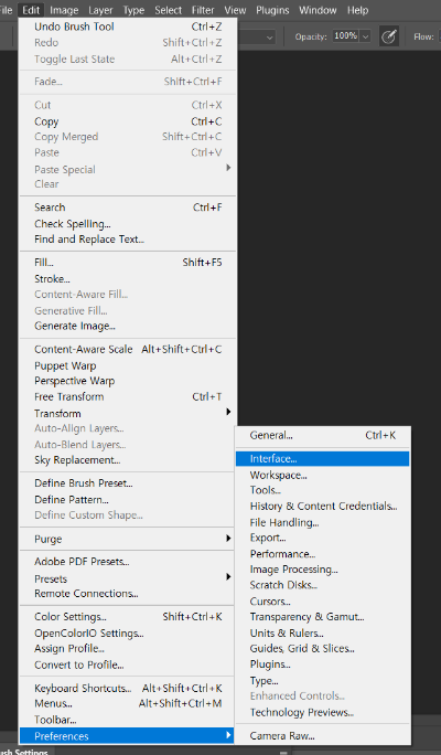 2. 메뉴에서 Edit(편집) > Preferences(환경설정) > Interface(인터페이스)